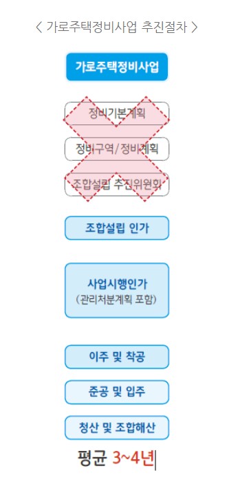 가로주택정비사업 절차는 정비기본계획 수립, 안전진단, 추진위원회 승인 등이 생략되고, 토지등소유자의 80% 이상 및 토지면적의 2/3 이상의 동의가 필요한 조합설립인가부터 시작합니다.
