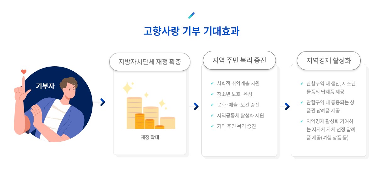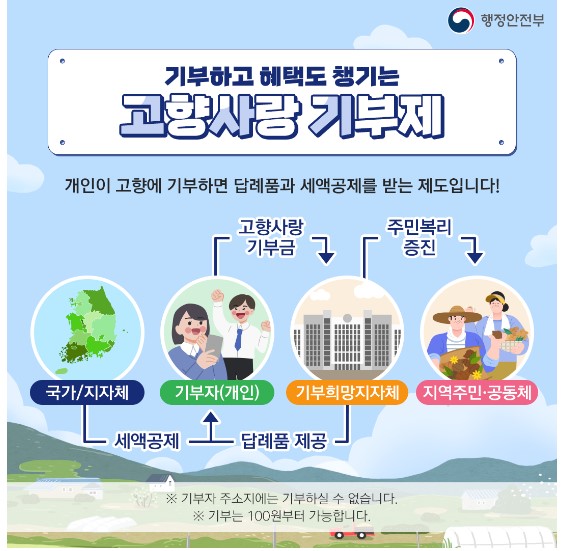 고향사랑기부제에 대해 들어보셨나요? 고향사랑 기부제는 개인이 현재 주소지를 제외한 본인의 고향이나 지방자치단체 (시도, 시군구)에 일정액을 기부하면, 기부자에게 세액공제 혜택과 답례품을 제공하는 제도입니다. 이 기부금은 지역 발전에 사용되며 기부자들은 세액공제 혜택과 답례품을 받을 수 있습니다.