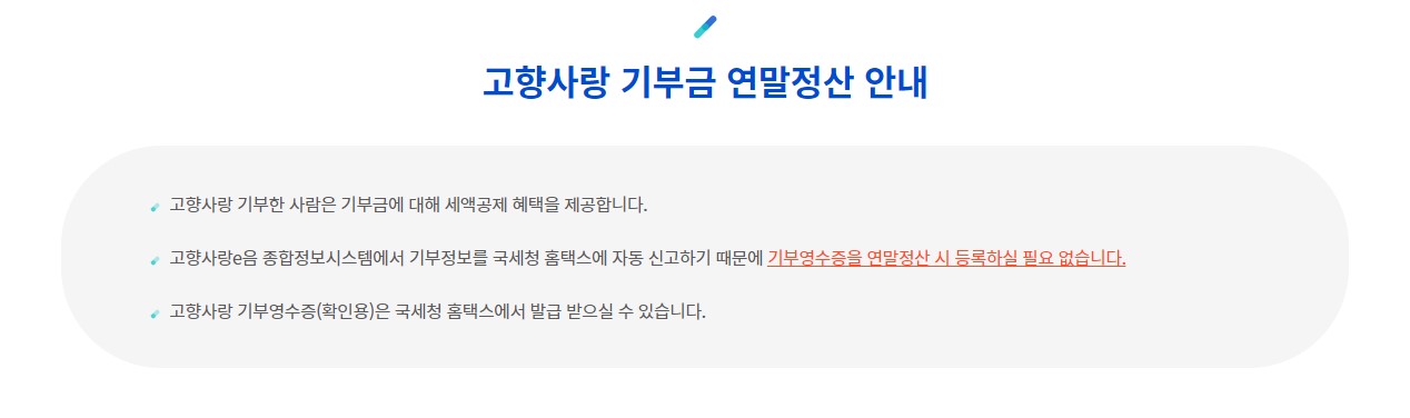 연말정산 또한 기부시 자동으로 홈택스에 신고되기 때문에 기부영수증을 연말정산시 등록할 필요가 없으며, 고향사랑 기부영수증은 홈택스에서 발급받을 수 있습니다.