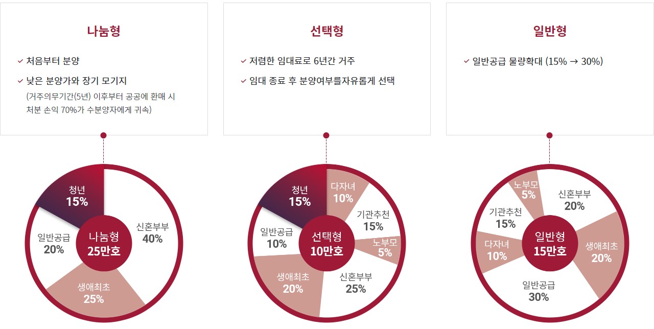 정부는 더 많은 사람에게 혜택을 주기 위해 세가지 유형으로 나누어 주택을 공급할 예정인데, 각각 나눔형, 선택형, 일반형 으로 나뉜다. 각각의 유형 안에 특별공급과 일반공급이 나누어져 있으니 본인의 유형에 맞춰 당첨이 유리한 쪽으로 청약을 신청해야 한다.