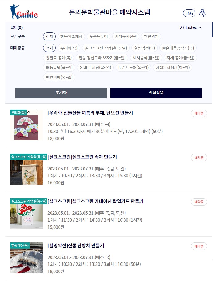 돈의문박물관마을 예약 시스템을 이용하여 다양한 체험 활동을 신청할 수 있습니다.