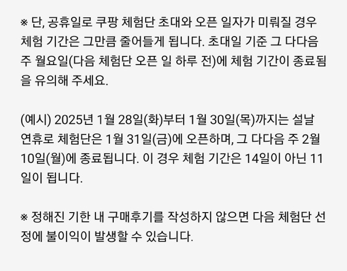 이전 체험단에서 긍정적이고 상세한 리뷰를 작성한 경우, 추후 선정 확률이 높아질 수 있습니다. 쿠팡을 통해 구매하는 모든 상품의 상품리뷰를 남겨주세요