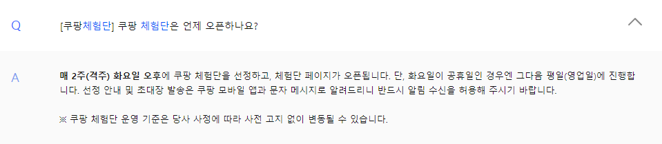 쿠팡 체험단은 정기적으로 2주 간격으로 화요일 오후 4시에 열리는 것이 일반적입니다.