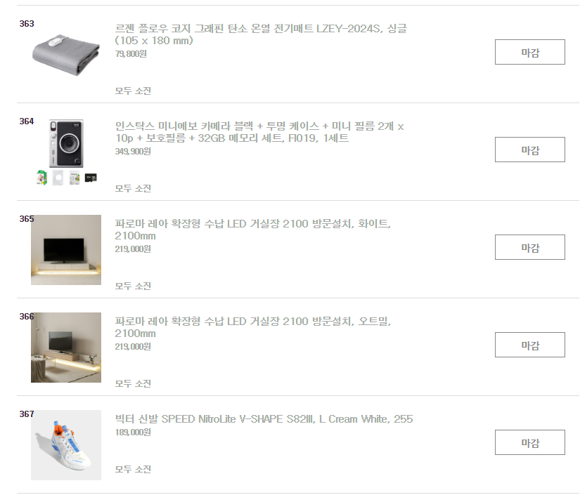 모집 시작 직후 바로 신청할 수 있도록 인터넷 환경을 점검하고, 앱을 미리 실행해 두세요.경험상 PC보다는 모바일에서 고가의 제품을 잡을 확률이 높습니다.