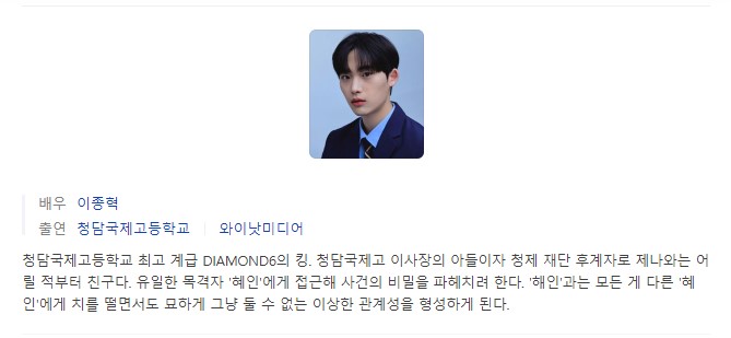 - 줄거리 : 여고생 살인사건의 유일한 목격자인 흙수저 '김혜인'이 모두가 선망하는 청담국제고등학교로 전학 온 뒤 유력한 용의자이자 교내 최고 권력인 다이아몬드6의 여왕 '백제나'를 만나 벌이는 치열한 권력 게임과 심리싸움을 그린 드라마