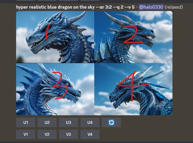 이미지의 순서는 다음과 같으므로 사이즈를 키워서 완성된 이미지로 보고싶은 번호를 업스케일 해주면 된다. 아래 v버튼은 자주 사용하지는 않는데, 해당 이미지에서 약간의 변형을 주고싶을 때 사용한다.