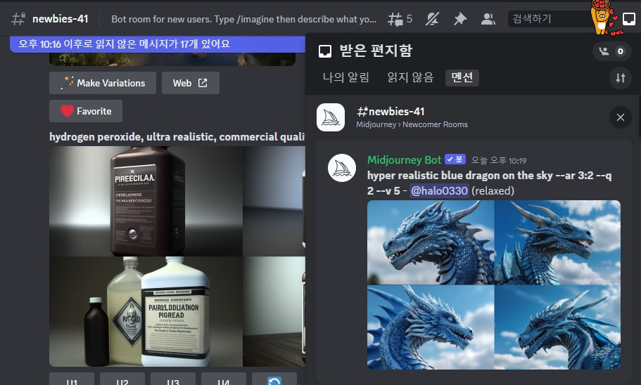 디스코드 창 우측상단의 편지함을 눌러서 나에게 온 미드저니 봇의 메신저를 확인하고 볼 수도 있지만 더 쉬운 방법은