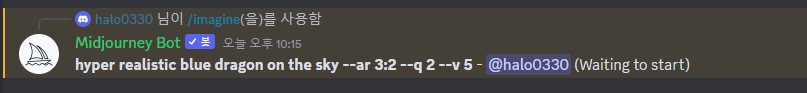 여기서 맨 앞은 자동으로 설정되는 세팅값이며, 중간 파란색 부분은 이미지 생성을 원하는 설명문, 마지막 초록색 부분은 이미지 비율에 대한 명령이다. 이미지 비율은 1:20까지 설정 가능한데, 여기서 중요한것은 띄어쓰기를 꼭 지켜주어야 제대로 프롬프트가 실행된다. sky[]--ar[]3:2 대괄호 친 부분은 꼭 띄어서 작성해주자.