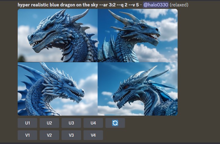 이미지 아래의 버튼은 U (UPSCALE) V(Various) 이다.