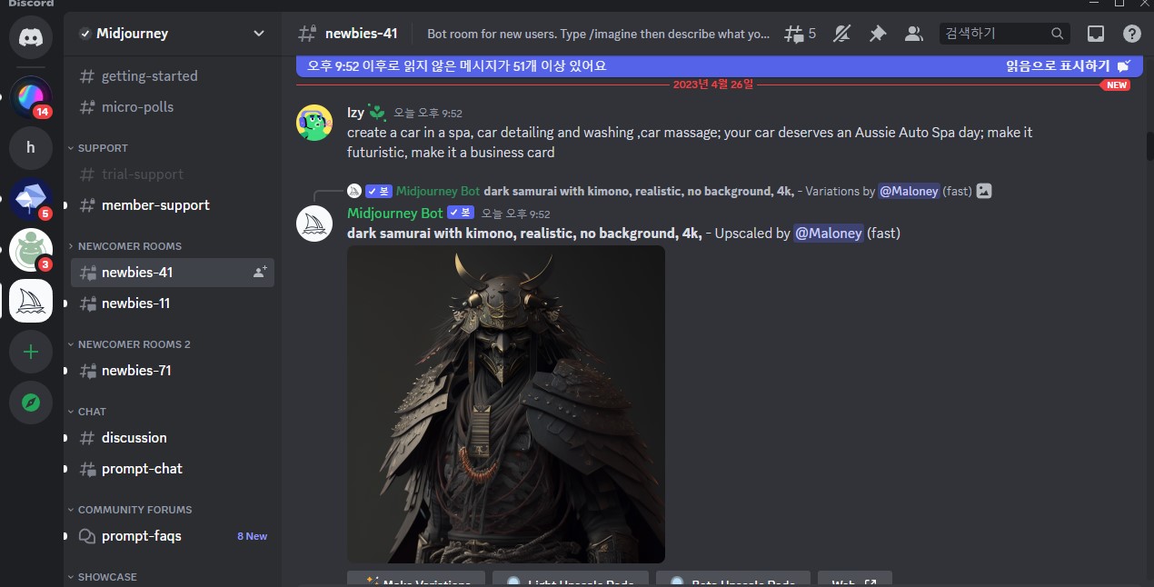 실행된 디스코드 실행창. 우측 돗단배 모양 아이콘이 미드저니 채팅방(?) 이라고 생각하면된다. 복잡해보이지만 미드저니는 스테이블디퓨전 등의 오픈소스 AI ART 생성기에 비해 사용법이 더 간편하다. 좌측의 카테고리는 공지사항, 뉴비방, 잡담방, Q&A등 일반 커뮤니티나 다를게 없고, 보통 뉴비 챗룸이나 제네럴 챗룸에 접속하여 채팅창에 프롬프트를 입력하여 이미지를 생성하는 방식이다.