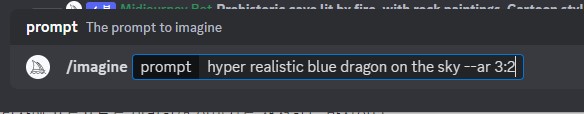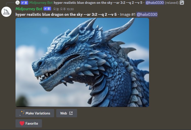 여기서 맨 앞은 자동으로 설정되는 세팅값이며, 중간 파란색 부분은 이미지 생성을 원하는 설명문, 마지막 초록색 부분은 이미지 비율에 대한 명령이다. 이미지 비율은 1:20까지 설정 가능한데, 여기서 중요한것은 띄어쓰기를 꼭 지켜주어야 제대로 프롬프트가 실행된다. sky[]--ar[]3:2 대괄호 친 부분은 꼭 띄어서 작성해주자.