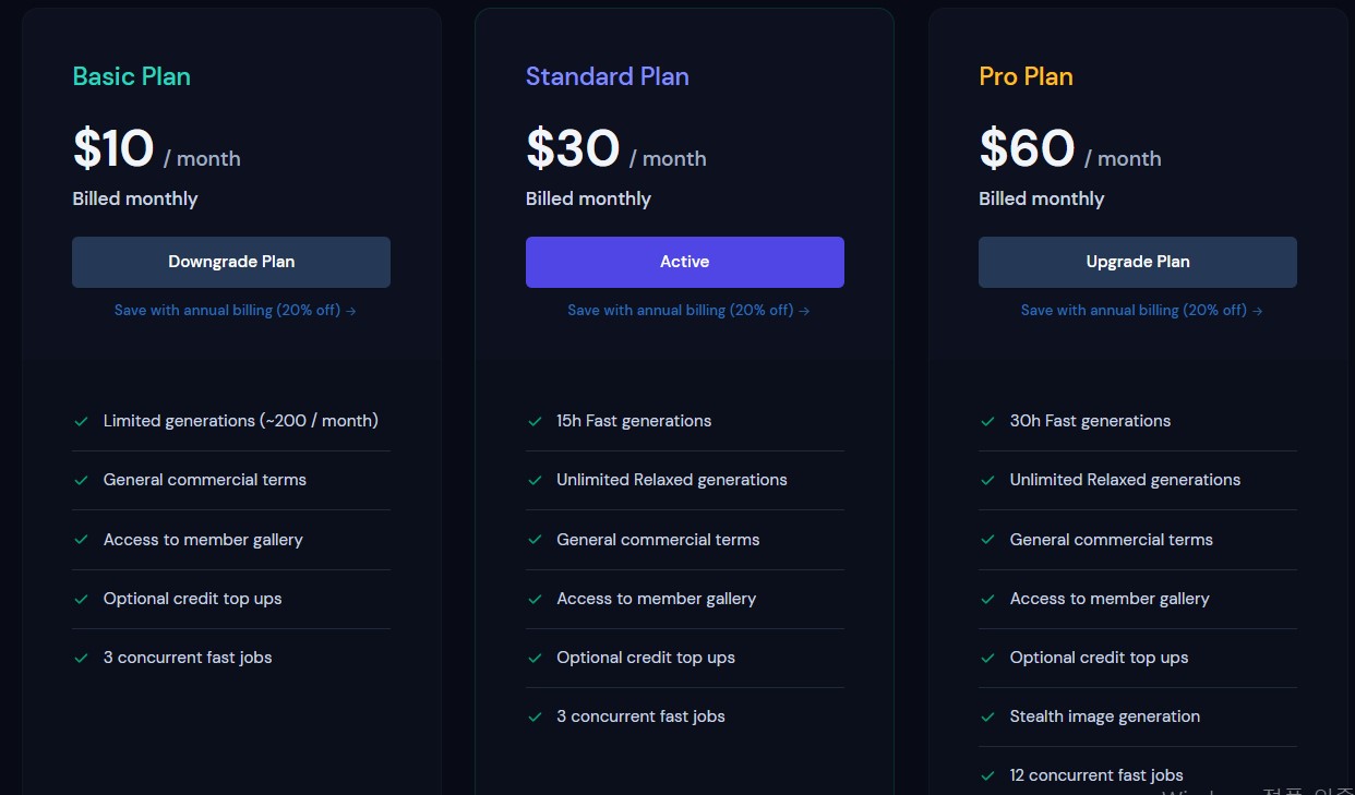 월 10불짜리 요금제는 한달에 200장까지, 30불 요금제에서는 무제한으로 사용할 수 있다. 또한 요금제에 따라 fast 시간을 주는데, fast모드를 소진하는 동안에는 이미지 생성이 relaxed모드에 비해 두세배정도 더 빠르다. 이 속도 때문에 상업적인 이용을 원할 경우 30불짜리 standard요금제를 사용하는게 전혀 아깝지 않다.