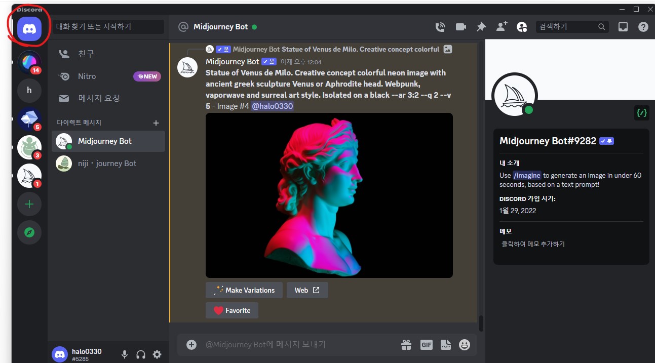 좌측 상단의 버튼을 누르면 다이렉트 메세지로 이동하며, 개인 채팅창을 연다고 생각하면 된다. 물론 미드저니 홈페이지로 들어가면 내가 만드는 이미지도 확인 가능하지만, 일단 다른사람들이 생성하는 이미지가 보이지 않기 때문에 심신의 안정을 찾을 수 있다.