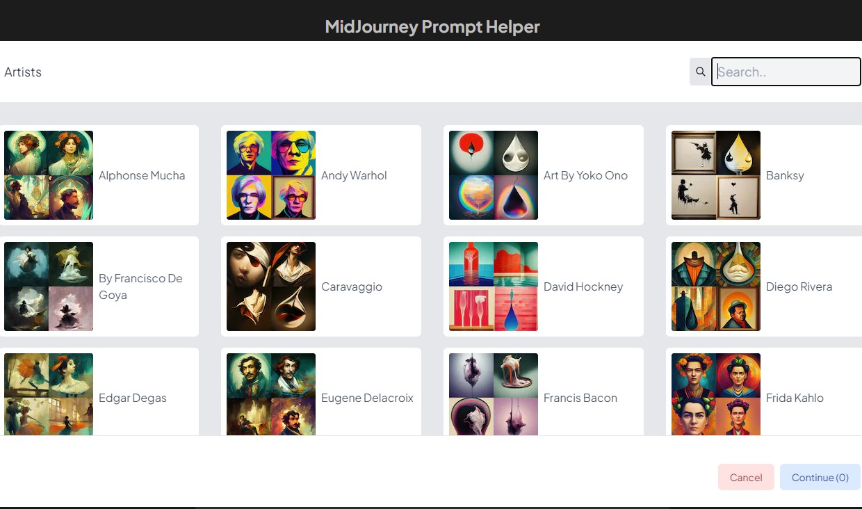 미드저니 프롬프트 헬퍼 에서는 원하는 이미지의 명령어를 넣고난 뒤 내가 원하는 스타일, 비슷한 아티스트 , 이미지의 컬러와 빛 등을 시각적으로 선택할 수 있는 선택지를 주는데 미드저니에 익숙하지 않은 초보자의 경우 이런 사이트를 사용하면 약간이나마 더 편하게 프롬프트를 생성할 수 있다.