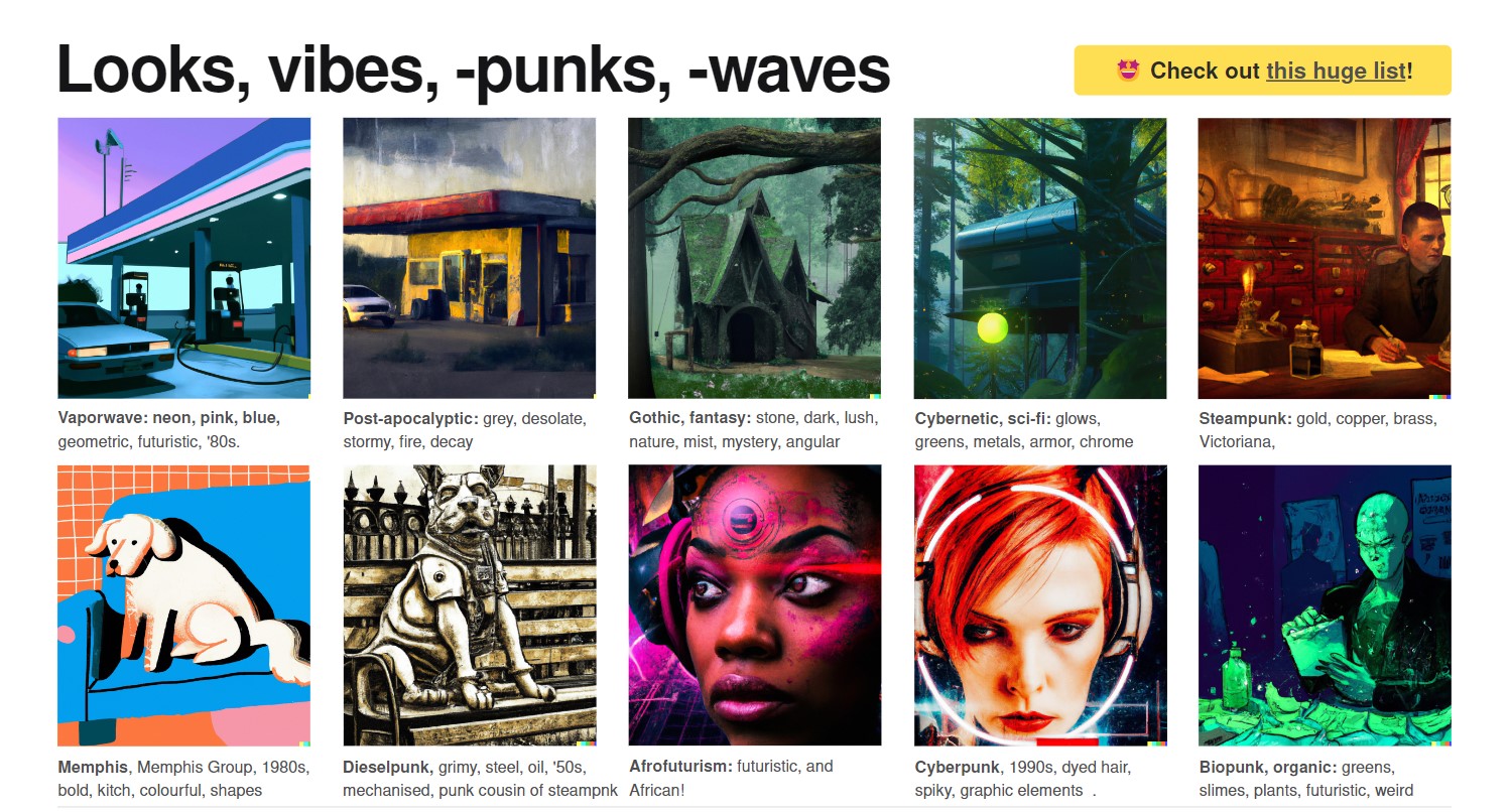 달리에서 나온 프롬프트북에는 시대별 이미지부터 사진 구도, 빛이나 필터에 대한 프롬프트 까지 꽤나 자세하고 알아보기 쉽게 정리되어 있어 처음 이미지 생성에 매우 도움이 된다.