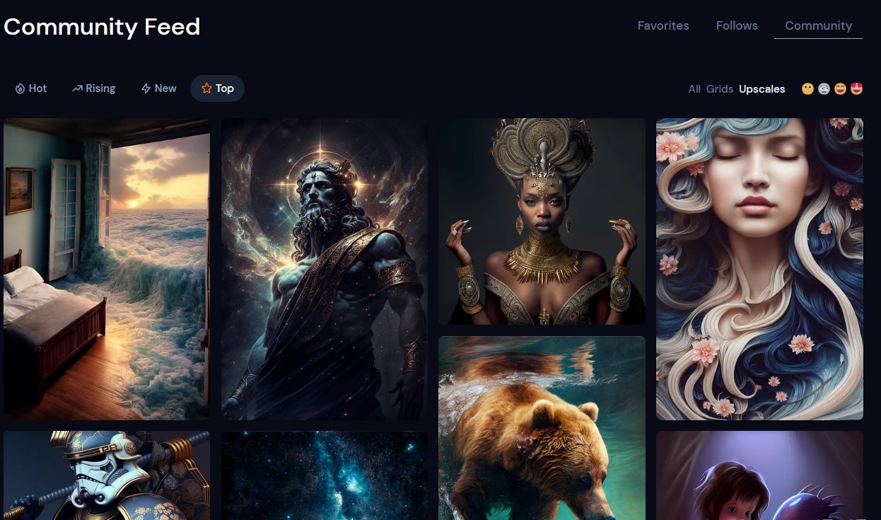 미드저니 홈페이지에서도 이미지 생성에 대한 아이디어를 얻을 수 있다. 공식 홈페이지 내 커뮤니티 메뉴를 들어가보면 수많은 사람들이 실시간으로 생성하는 이미지를 확인할 수 있는데, 여기에서 내가 원하는 키워드를 검색해서 다른 사람들이 어떤 이미지를 생성했는지 볼 수 있으며 사용한 프롬프트 또한 볼 수 있다. 원하는 이미지를 눌러서 하단으로 내려보면 비슷한 프롬프트로 생성된 다른 이미지들까지 함께 볼 수 있어 매우 편리하다.