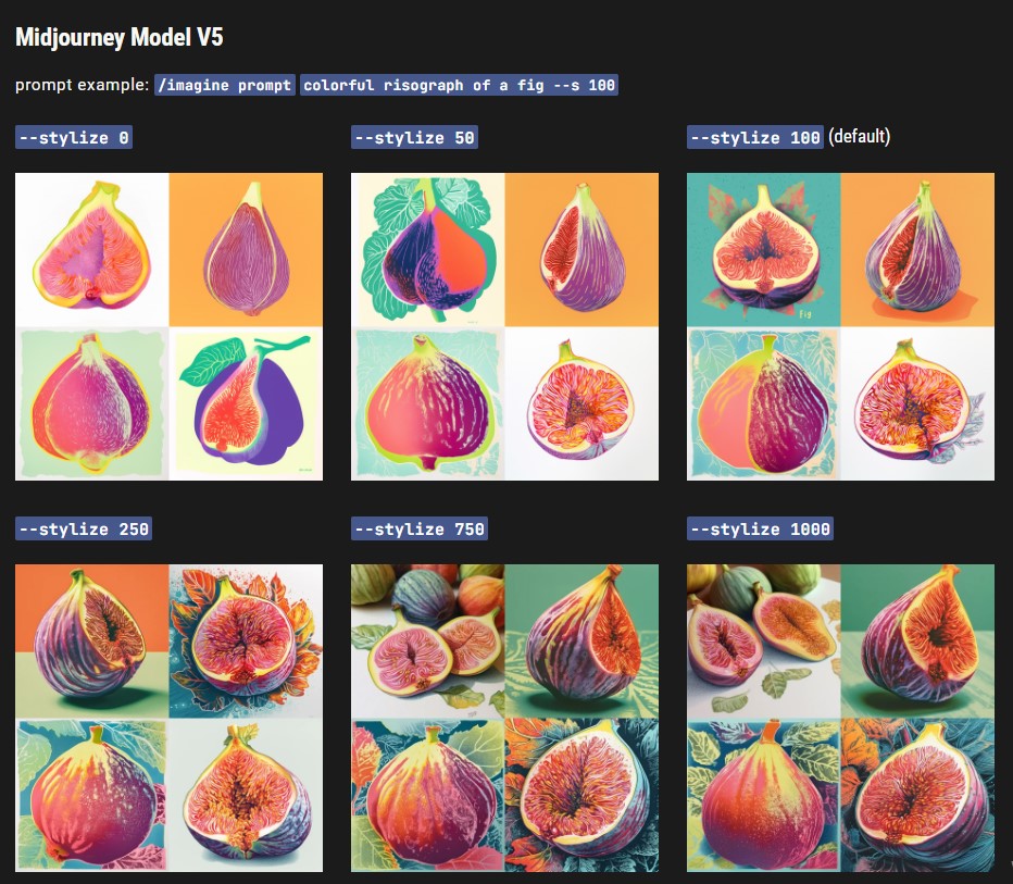 - Parameters : 패러미터 즉 변수값에 대한 부분은 --ar --tile --version(--v) --stylize 등이 있다. 이미지 외적인 요소로 비율이나 생성버전, 이미지 스타일 등에 관련된 부분이다. --tile 사용하면 이미지는 seamless 패턴, 즉 계속해서 이미지를 반복해도 끊김이 없는 패턴을 생성할 수 있으며 --ar 은 aspect ratio 의 약자로 이미지의 비율을 조절할 수 있다 (v5기준 무제한) --stylize는 뒤에 붙는 숫자값에 따라 이미지의 스타일을 변경한다.