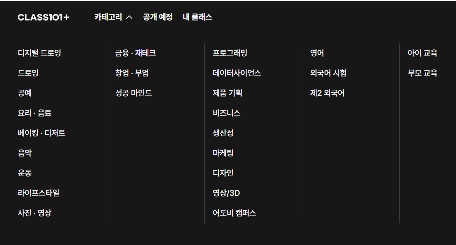 이런 클래스 열풍의 메인이 [CLASS 101] 인데, 수공예품 판매 플랫폼에서 공예 클래스(강의)를 볼 수 있게 된 아이디어스나 수공예품에 집중된 솜씨당, 코딩/생산성 강의에 집중된 패스트캠퍼스에 비해 클래스101에서는 공예, 비지니스, 언어, 운동 등 정말 다양한 카테고리의 강의를 들을 수 있는 점이 아주 매력적이었다.