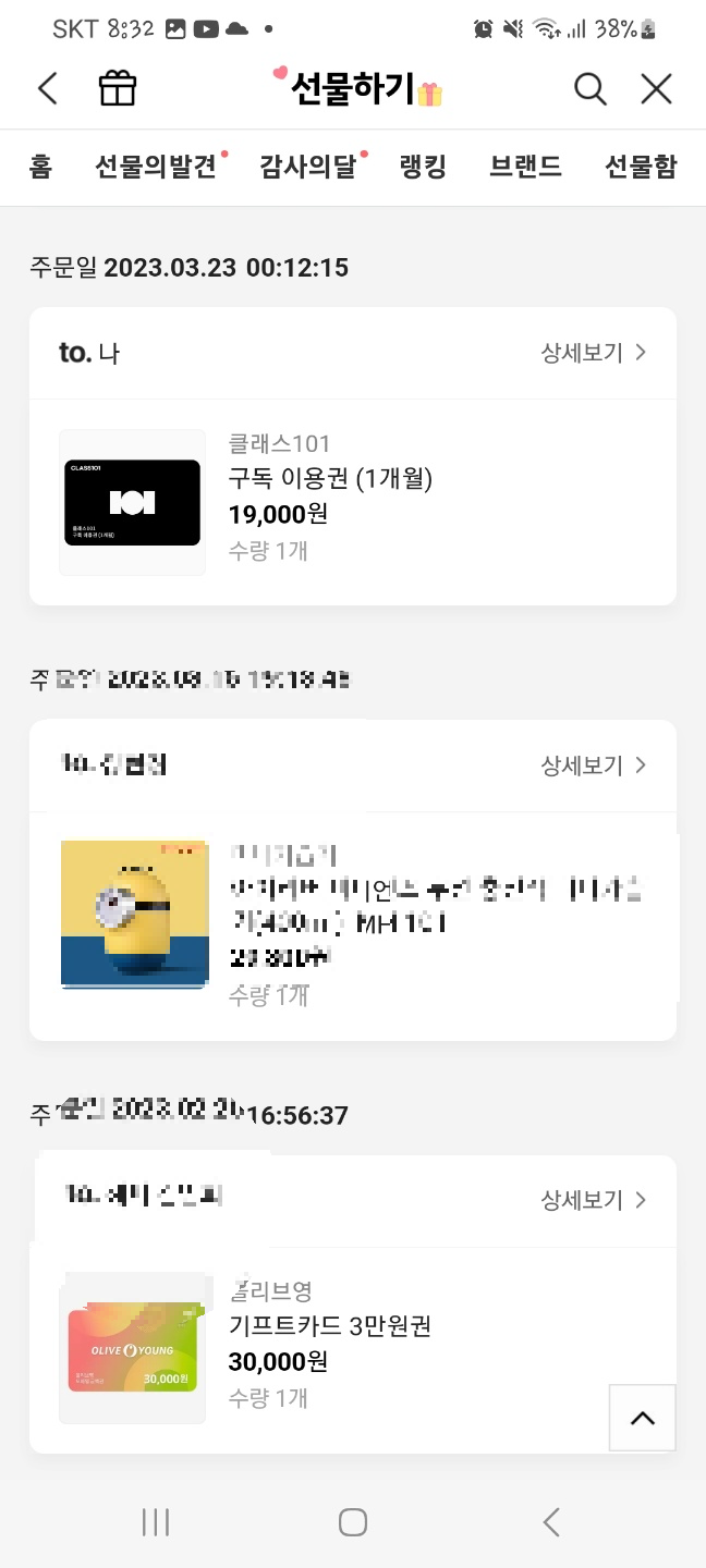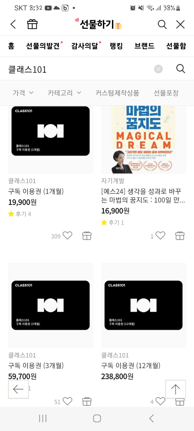 클래스101사이트에서는 월간 이용권을 더이상 판매하지 않는다. 하지만 여전히 월간이용권이 판매되고 있는곳이 있으니 그곳이 바로 카카오톡 선물하기 이다.