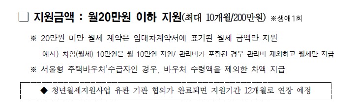- 지원 금액 : 월 20만원 이하 최대 10개월(200만원) 이지만 12개월로 연장예정이며, 생애 1회만 지원 가능하다.