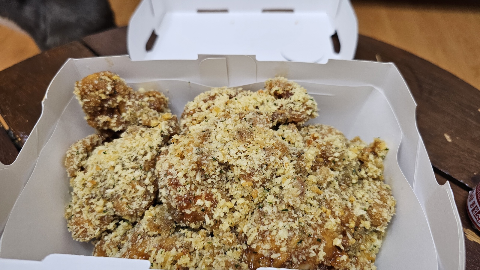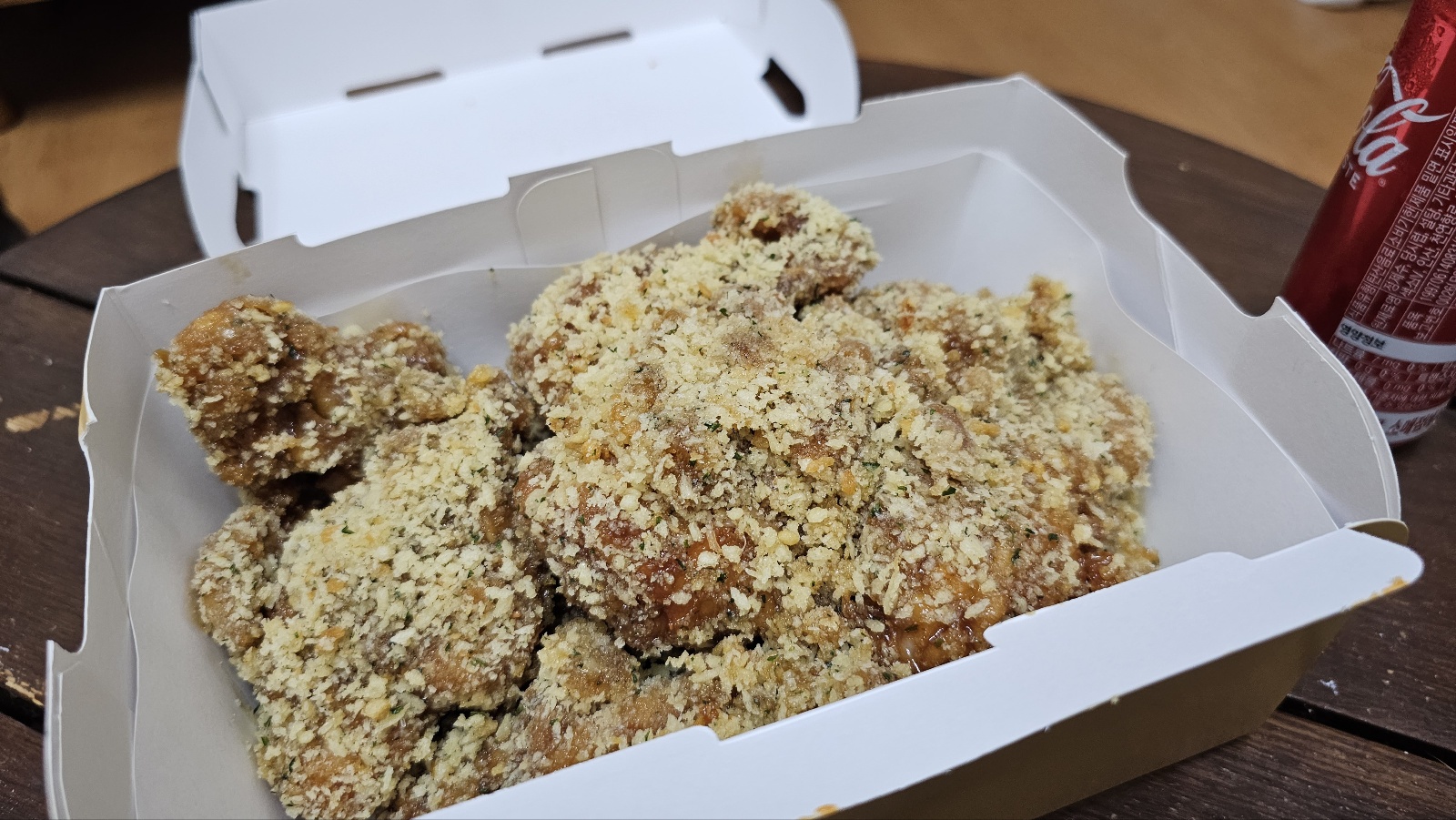 뿌링클이 시즈닝으로 단짠단짠의 정석을 보여주었기에, 버터와 마늘이 들어간 맛없을 수 없는 조합이라 크게 기대하고 주문했다. 집근처 지점에서 30분만에 받아본 치킨