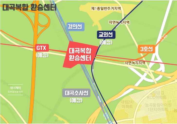 GTX-A 노선에서 가장 큰 수혜지는 대곡역 입니다. 킨텍스와 운정의 경우 서울과 물리적 거리가 너무 멀고 서울과 가장 가까운 역인 대곡역은 3호선과 경의선 두 라인이 이미 지나가고 있는데, 여기에 GTX-A노선과 서울 교외선과 대곡소사선이 개통을 앞두고 있어 5개의 노선이 환성하는 복합 환승센터가 조성될 예정입니다. 대곡 소사선은 올해 6월 말 개통을 앞두고 있으며, 교외선은 6월 착공하여 24년 개통이 예정되어 있습니다.