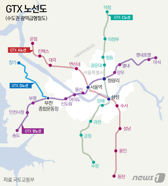 전세 계약 만료일이 다가오면서 같은 금액으로 서울에서 북적북적 사느니 차라리 외곽으로 이사가는게 나을까 고민이 많아지는 요즘입니다. 본가가 일산이라 일산에서 출퇴근을 생각해 봤는데, 서울 한복판에 있는 회사까지 출퇴근 시간이 너무 오래걸리겠더군요. 그나마 내년도에 개통 예정인 GTX 노선 근처로 이사간다면 서울 접근성이 좋아지지 않을까 하여 GTX 노선을 정리해보았습니다.