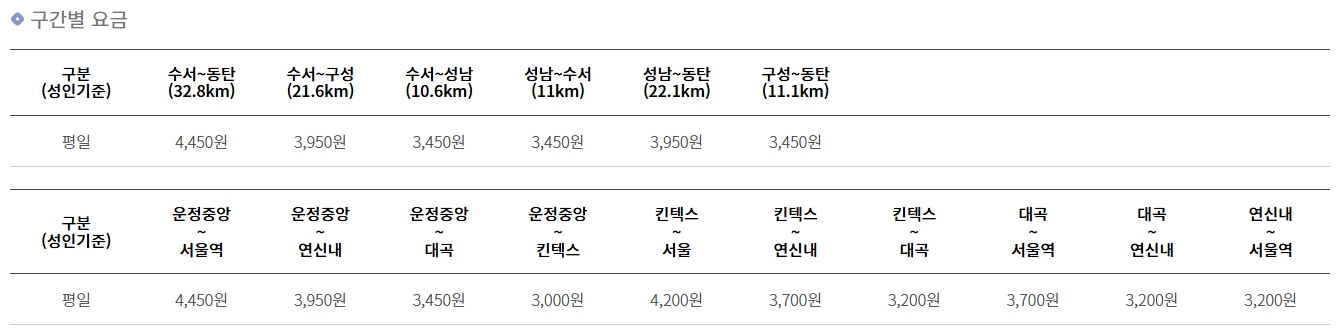 구간별 요금표 ( 운정중앙, 킨텍스, 대곡 , 서울역)