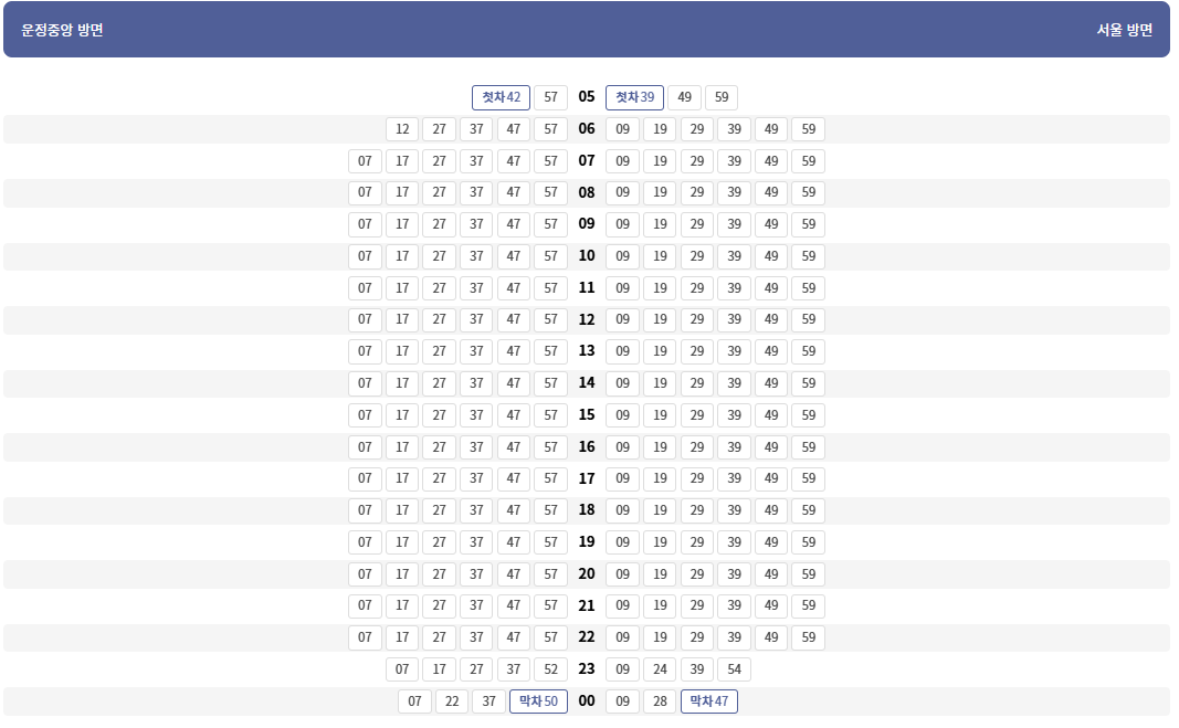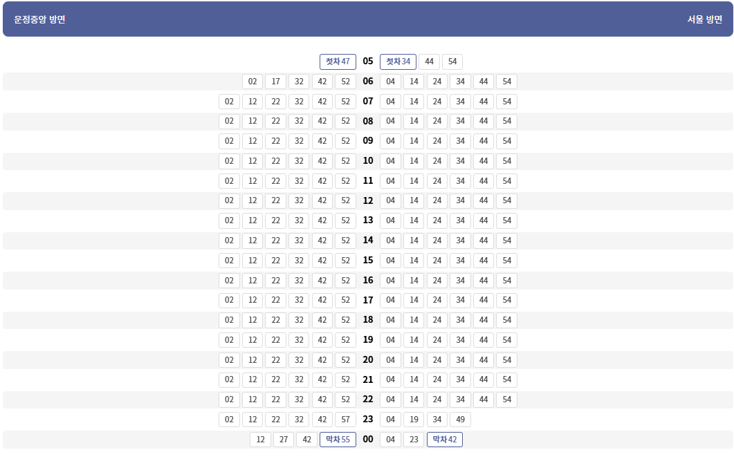 서울행 첫차는 5시 39분, 막차는 12시 47분으로, 새벽에 근무하시는 분들에게도 희소식입니다.